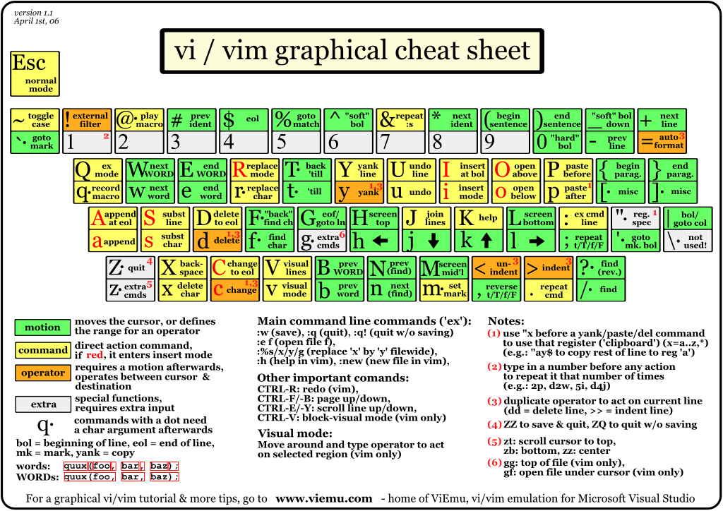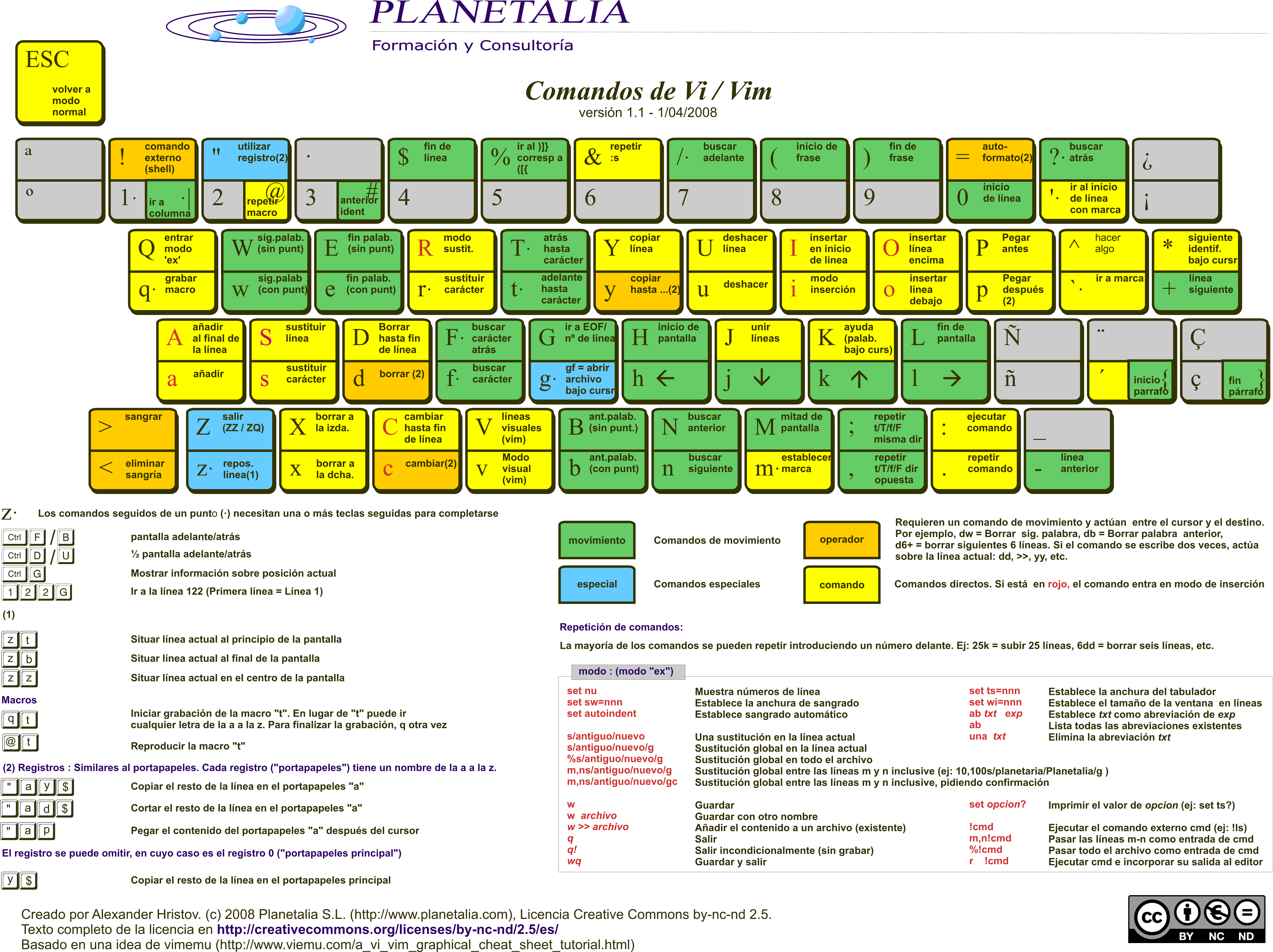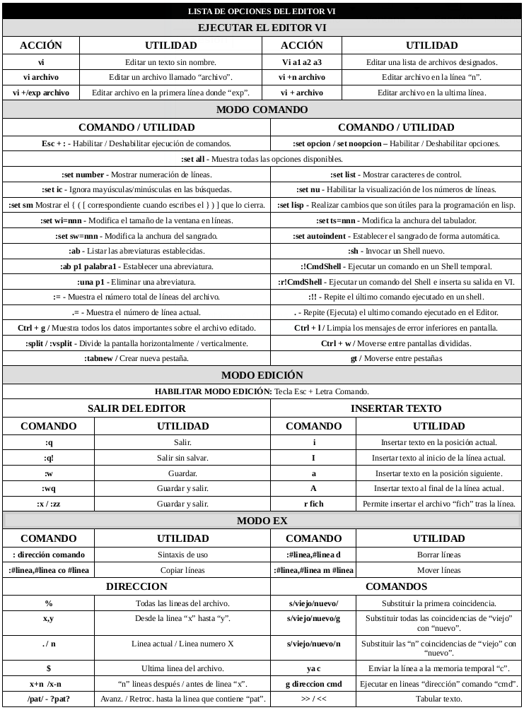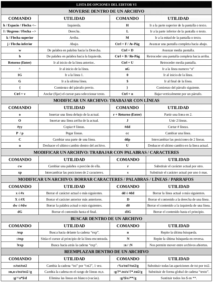 A continuación 2 imágenes de resumen de los comandos más importante del Editor VI: