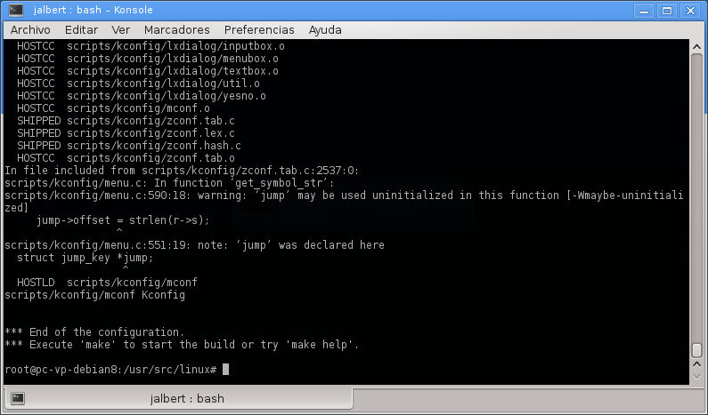 Eliminar (Limpiar) los archivos de configuración y los fuentes del kernel anterior: make clean && make mrproper