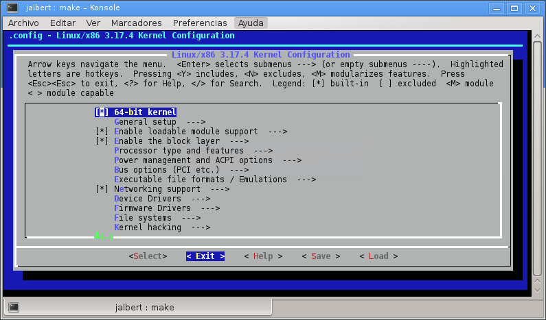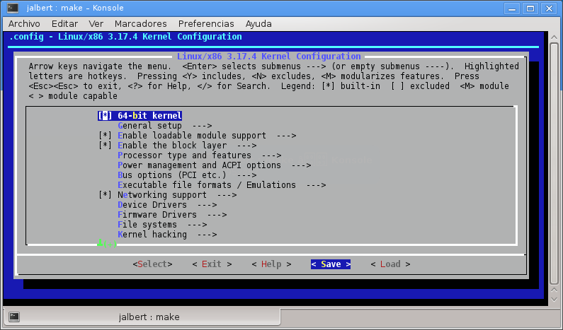 Como se puede ver en las imágenes anteriores que muestran los pasos a seguir, una vez que realice la configuración de su elección, dentro del montón de diferentes opciones disponibles para su núcleo, salve la configuración y salga del menú. De hecho, hay demasiados opciones dentro del menú para el alcance de este tutorial. Para seleccionar las opciones del Kernel de su preferencias, la mejor manera es por ensayo y error, junto a una detallada y exhaustiva investigación en Google. Esta es la mejor manera de aprender. Si usted está simplemente tratando de actualizar el kernel a la versión más reciente, usted no tiene que cambiar nada y puede simplemente seleccionar «Guardar configuración», teniendo muy en cuenta si debe esta seleccionada o no la primera opción relativa a si el kernel será para 64 bits o no.