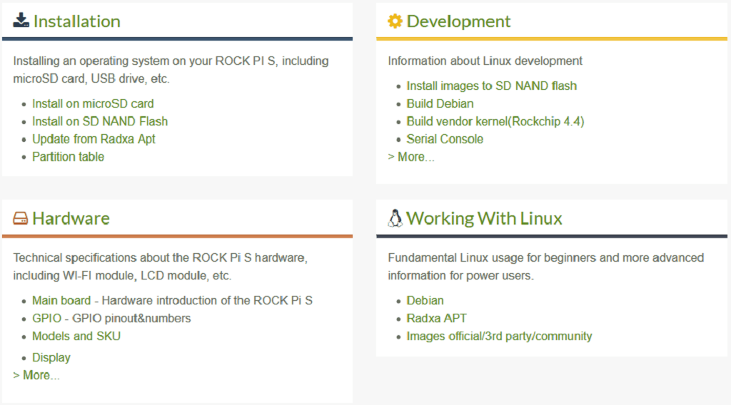 En la página del fabricante, Radxa, se pueden conseguir muchas guías y tutoriales para la instalación, configuración y uso del dispositivo «Rock Pi S» con Linux, ya sea mediante una imagen optimizada de DEBIAN o construida usando Buildroot.