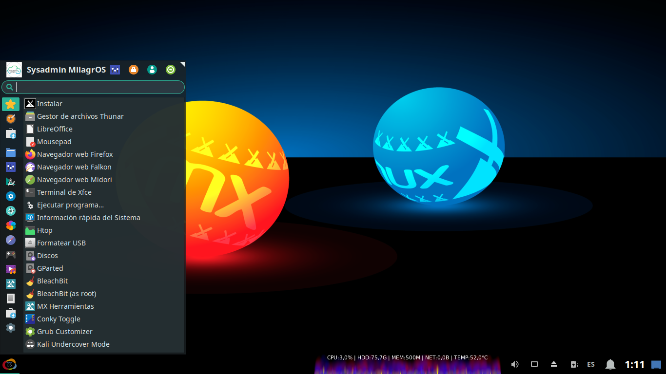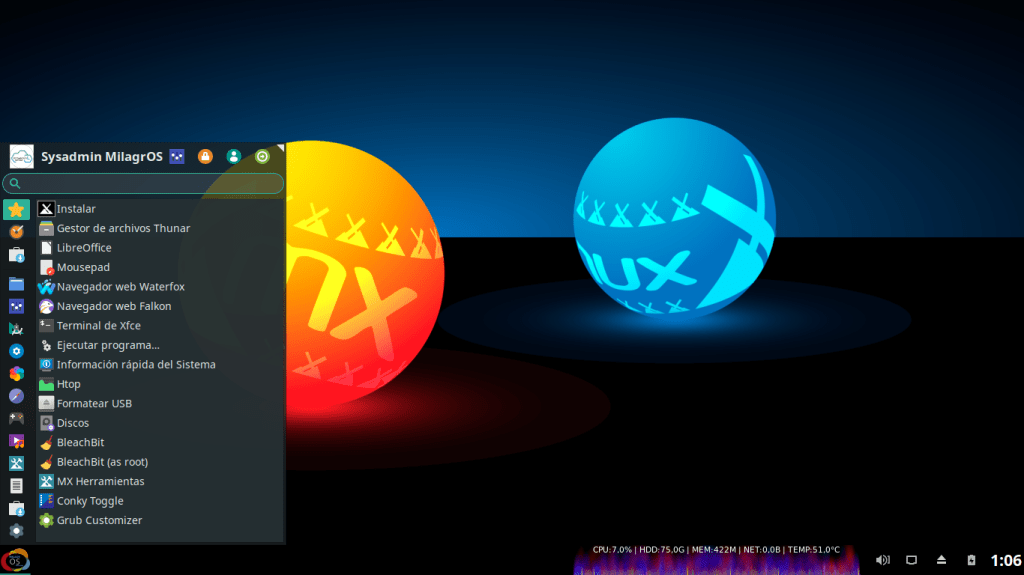 “MilagrOS GNU/Linux, is an unofficial edition (Respin) of the Distro MX-Linux. It comes with extreme customization, configuration and optimization, which makes it ideal only for 64-bit computers, both low resource (1 GB RAM) and / or old, as for modern and / or high-end. It is focused on being useful mainly for users with no or limited Internet potential and / or limited knowledge of GNU / Linux, as it has a philosophy of use of the type «Turnkey» or «Install and Use», which allows, once obtained (downloaded) and installed, and can be used effectively and efficiently without the Internet, as everything you need and more is pre-installed, and highly customized, configured and optimized.”