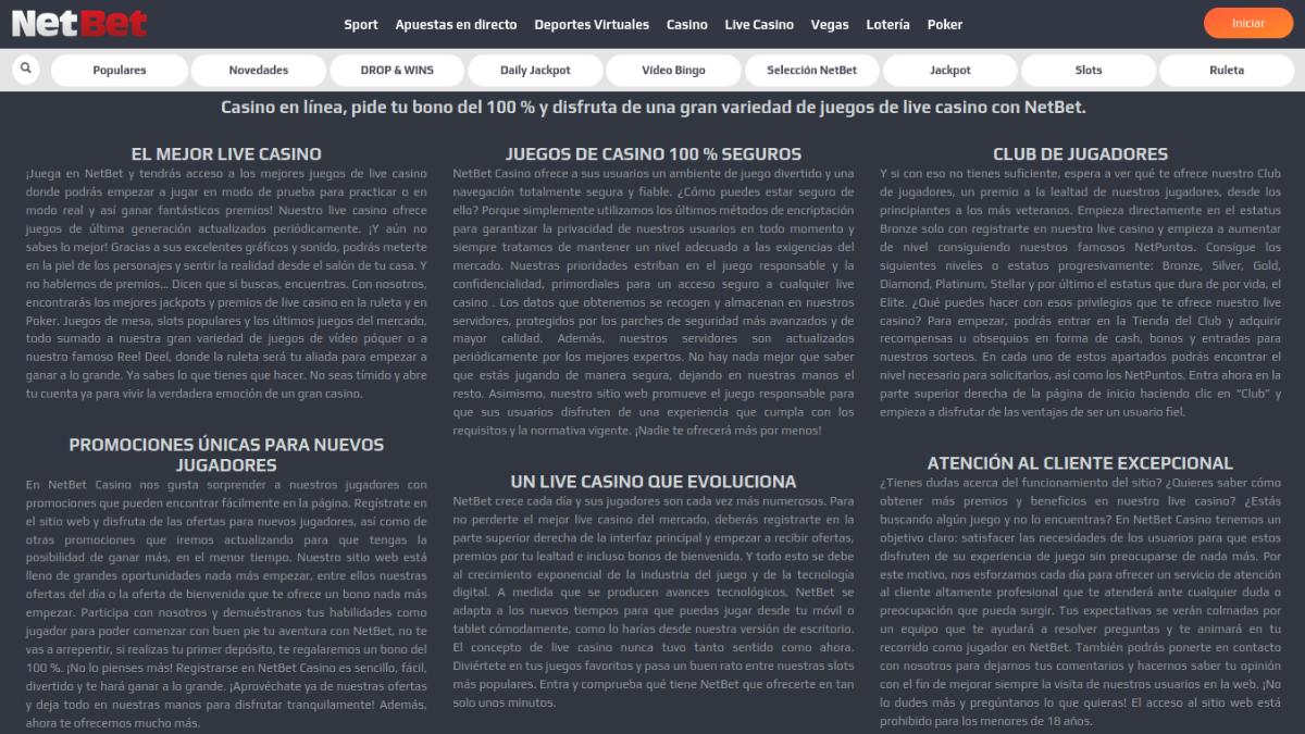 Tanto en uno de sus sitios web en inglés (https://casino.netbet.com/in), como en español (https://casino.netbet.com/es), NetBet Casino se describe cortamente a sí mismo como: