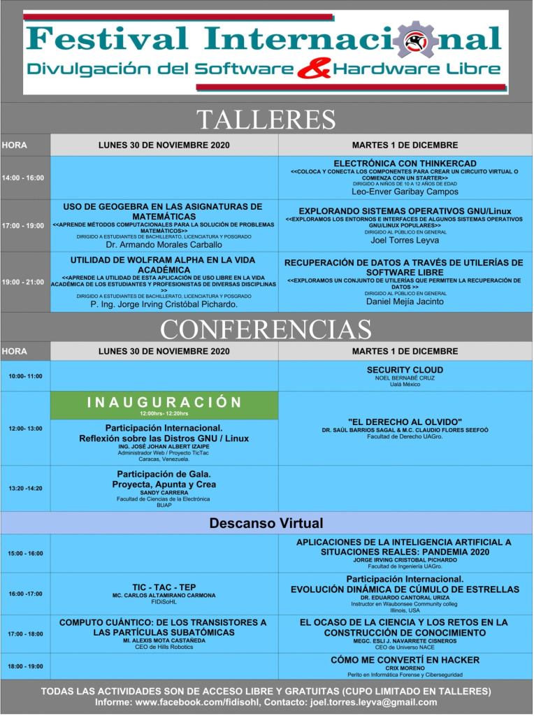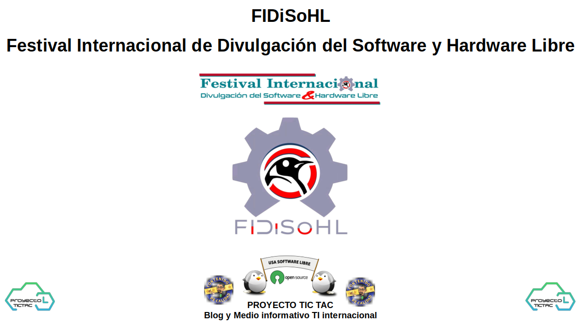 Este 30/11/2020, se celebrará nuevamente el Festival Internacional de Divulgación del Software y Hardware Libre (FIDiSoHL), el cual está integrado por diversas personas que tienen pasión por compartir conocimiento bajo la filosofía del Conocimiento Libre, y cuyos integrantes provienen de diversas áreas de las Tecnologías y de diversos campos de acción, y entre todos integran una comunidad multidisciplinaria que promueve el uso de Software y Hardware Libre, así como su filosofía.