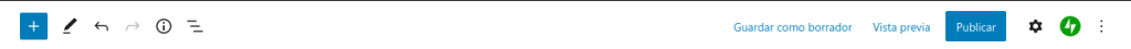 Aunque en línea y directamente sobre WordPress, puedes ahondar con excelente detalles técnicos cada uno de estos elementos que te mostraremos a continuación y los anteriores elementos descritos en la parte 1, haciendo clic en el siguiente enlace «Editor de WordPress: Uso de Bloques«, además de poder experimentar todo el potencial del Editor de Bloques, haciendo clic en el siguiente enlace «Editor de Bloques Gutenberg«, aquí te explicaremos brevemente lo más esencial de cada botón de la barra superior.