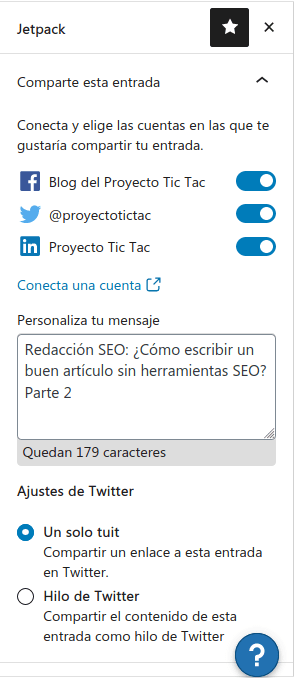 Uso: Permite habilitar/deshabilitar las opciones de compartir el contenido creado por los diversos medios web especificados, tales como redes sociales. Además, permite personalizar el mensaje de publicación de las mismas al ser compartido, realizar ajustes de la publicación vía Twitter, y obtener un Enlace corto para la publicación, entre otras cosas más.