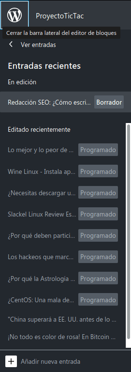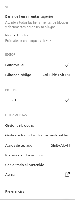 Como se puede apreciar, en la imagen superior inmediata, dicho Menú para la Administración de Entradas en un Blog de WordPress es visible presionando el primer botón de la barra superior dentro del Editor de Bloques de WP.