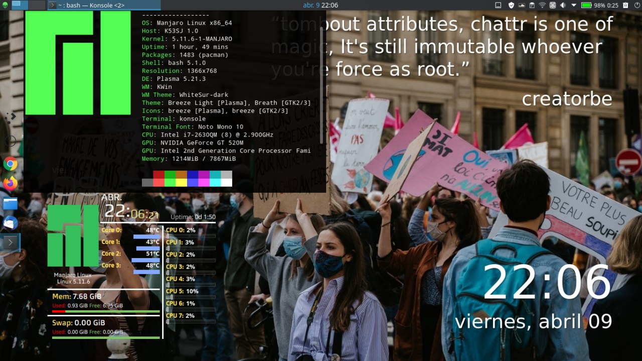 Hoy, 10/04/2021, te invitamos a disfrutar de algunas de las más hermosas y espectaculares capturas de #FondosDePantalla ( #Wallpapers ) de #Escritorios de Sistemas Operativos #GNU #Linux, las primeras creadas partiendo de diferentes personalizaciones de MilagrOS GNU/Linux y luego unas provenientes principalmente de los Grupos de #Telegram llamados #ViernesDeEscritorio, #ProyectoTicTac y muchos otros usuarios y grupos de #Twitter y #Facebook, recopilados de la celebración del «Viernes de Escritorio» del 09/04.