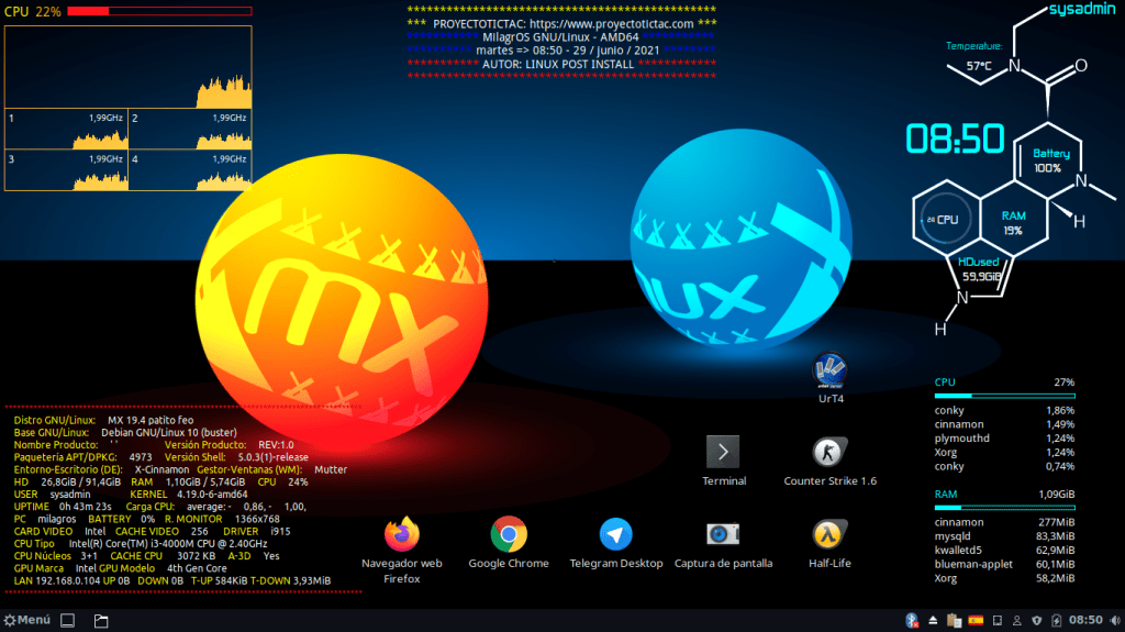 Hoy, 02/07/2021, te invito a disfrutar de algunas interesantes y llamativas capturas de pantalla del Escritorio de mi Sistema Operativo GNU Linux, que es un Respin Comunitario de MX Linux llamado MilagrOS GNU/Linux.