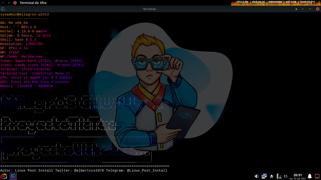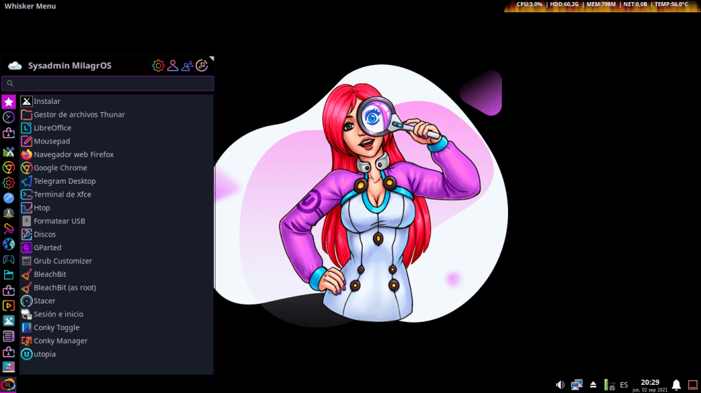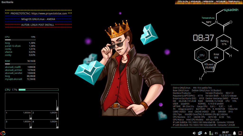 Hoy, 03/09/2021, te invito a disfrutar de algunas interesantes y llamativas capturas de pantalla del Escritorio de mi Sistema Operativo GNU Linux, que es un Respin Comunitario de MX Linux llamado MilagrOS GNU/Linux.
