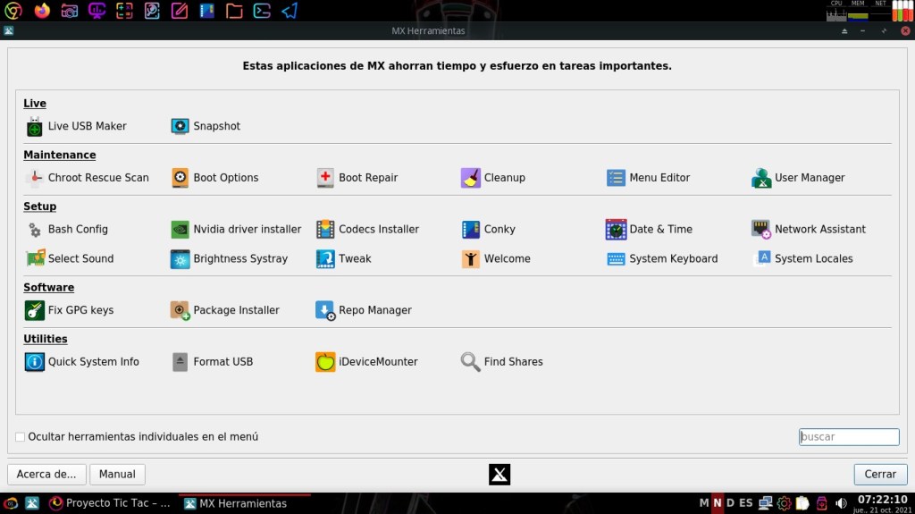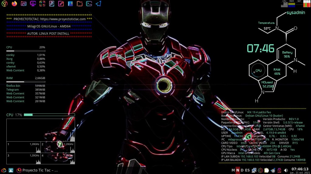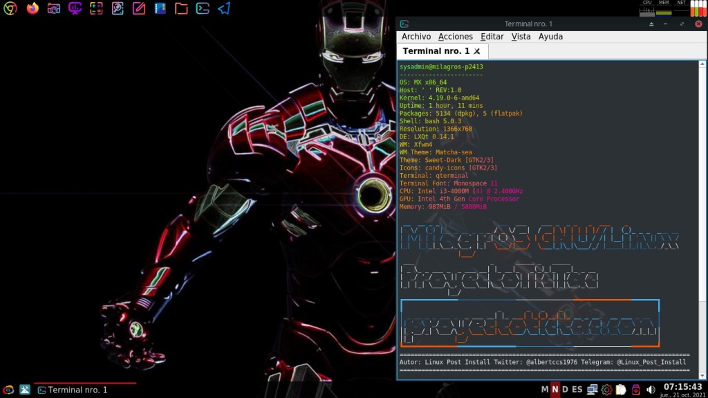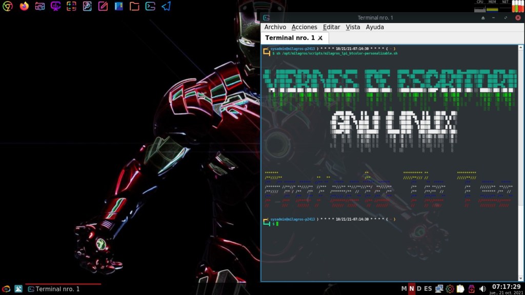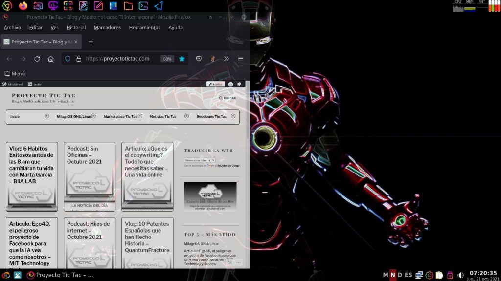 Hoy, 22/10/2021, te invito a disfrutar de algunas interesantes y llamativas capturas de pantalla del Escritorio de mi Sistema Operativo GNU Linux, que es un Respin Comunitario de MX Linux llamado MilagrOS GNU/Linux.