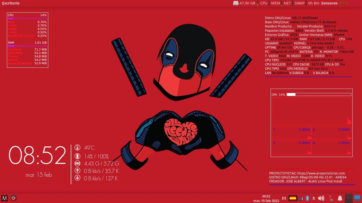 Hoy, te invitamos a disfrutar de algunas interesantes y llamativas capturas de pantalla del Escritorio de nuestro Sistema Operativo GNU Linux, que es un Respin Comunitario de MX Linux llamado MilagrOS GNU/Linux.