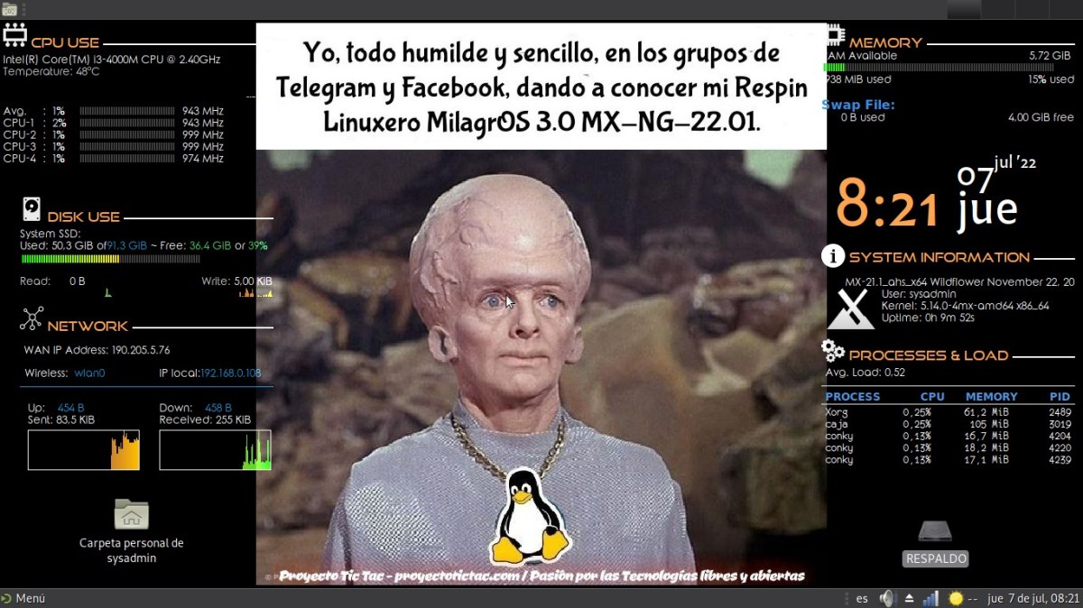 Además, a partir de este año las capturas de pantalla serán con la nueva versión llamada MilagrOS MX-NG-AHS 22.01. La cual está basada en MX-Linux 21 (Debian 11) con los repositorios AHS. Y vendrá con FluxBox, para equipos modernos de pocos recursos (- 1.0 GB RAM / – i3 CPU) y con XFCE para equipos modernos de muchos recursos (+ 1.0 GB RAM / + i3 CPU) de Hardware. Y solo ocupa – 3.0 GB ISO / – 9.0 GB DD).