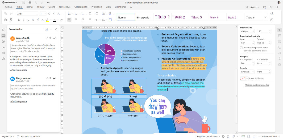 En cuanto a la colaboración en tiempo real, cabe mencionar que en esta versión se ha mejorado significativamente con comentarios con colores únicos para cada usuario, la visualización precisa del inicio y el final del texto comentado, una selección de texto más rápida con doble o triple clic, así como una pestaña dedicada Encabezado y Pie de Página. Estos cambios están pensados ​​para facilitar el trabajo a todos, especialmente a quienes trabajan en grupos o equipos grandes.