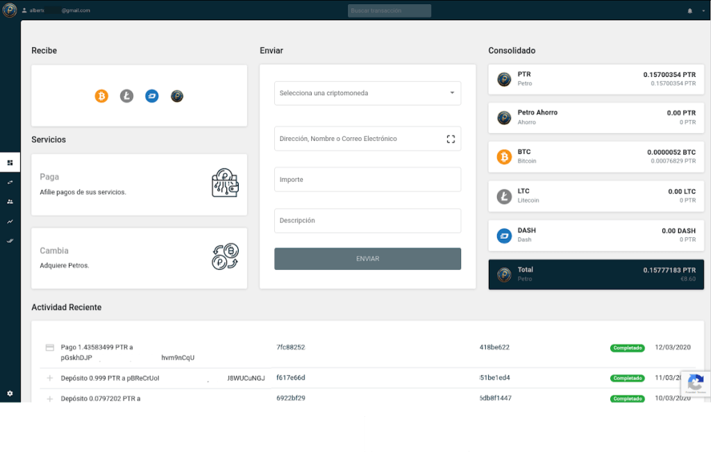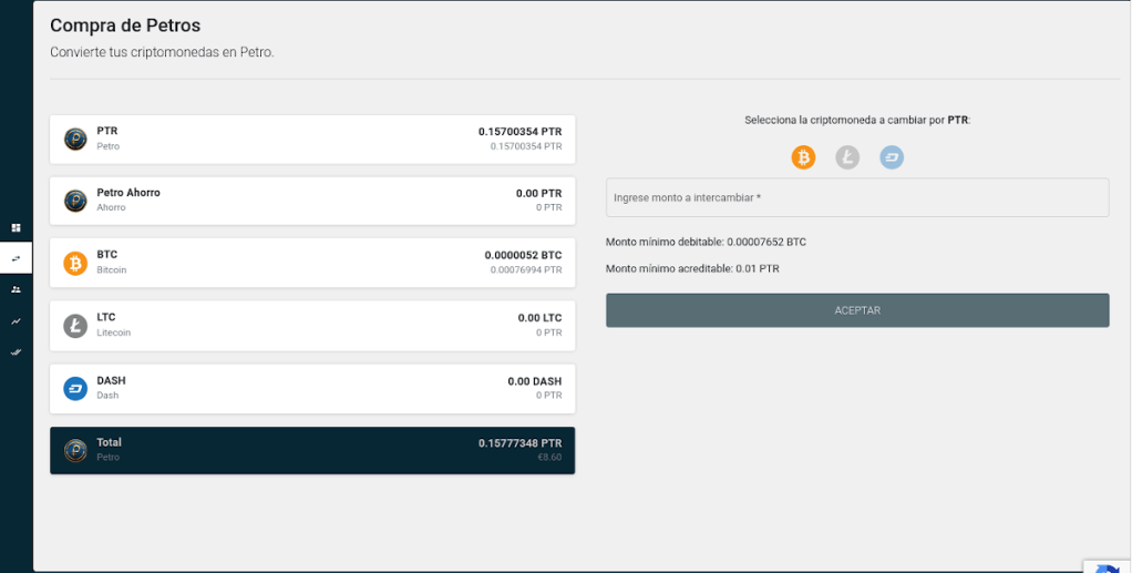 La misma, actualmente permite administrar los Petros (PTR) de los usuarios y también sus Bitcoin (BTC), Litecoin (LTC) y Dash (DASH), los cuales pueden ser usados para comprar el criptoactivo nacional. Por ahora, no se permite lo contrario, es decir, comprar BTC, LTC y DASH con PTR acumulados en la misma.