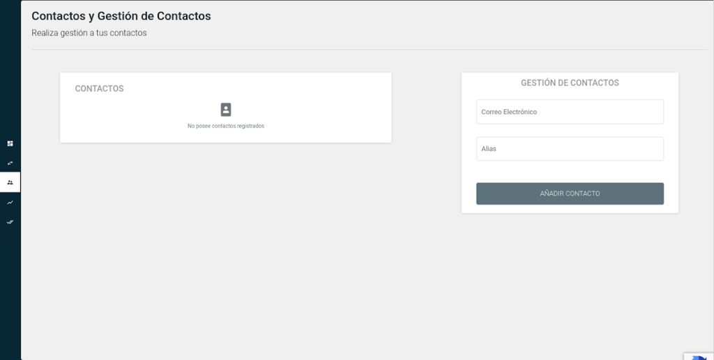 Este módulo permite gestionar nuestros contactos (usuarios conocidos) dentro y fuera del Sistema PetroApp, indicando del lado derecho un Nombre o Alias, un Correo electrónico y la dirección de la Billetera del Usuario conocido a agregar. Del lado izquierdo, se permite realizar búsquedas entre el directorio de contactos creado.